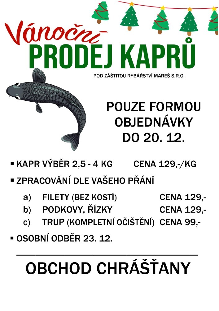 Vánoční prodej kaprů v Obchodě smíšeného zboží v Chrášťanech. Prodej probíhá pouze formou objednávky do 20.12. 2025 - osobní odběr je dne 23.12. 2025. Objednávejte na místě (obchod), nebo telefonu: 385 727 122. Ryby jsou ze sádek Čejetice (Strakonice) - Krajské školní hospodářství Protivín - pod záštitou Rybářství Mareš.
